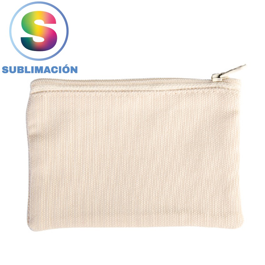 Poliéster, tamaño 22 x 14 x 6.5 cm, con zíper y tirador en color natural y azul