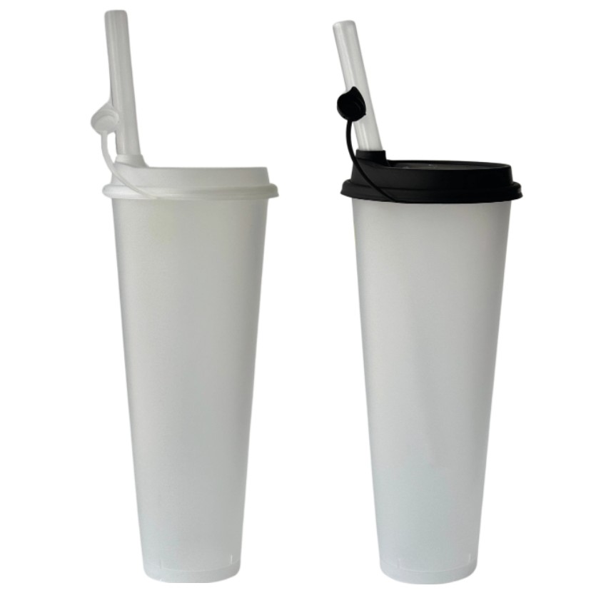Material plástico, tapa con pajilla de 24 oz., color negro y blanco