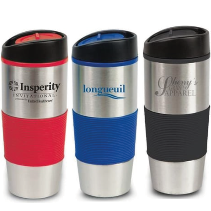 Doble pared, de 16 oz. acero inox. exterior interior plástico, banda silicona, en azul, rojo y negro