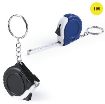 Llavero flexómetro plástico, cinta 1 metro, tamaño 4.3 x 4.1 cm, en negro y azul