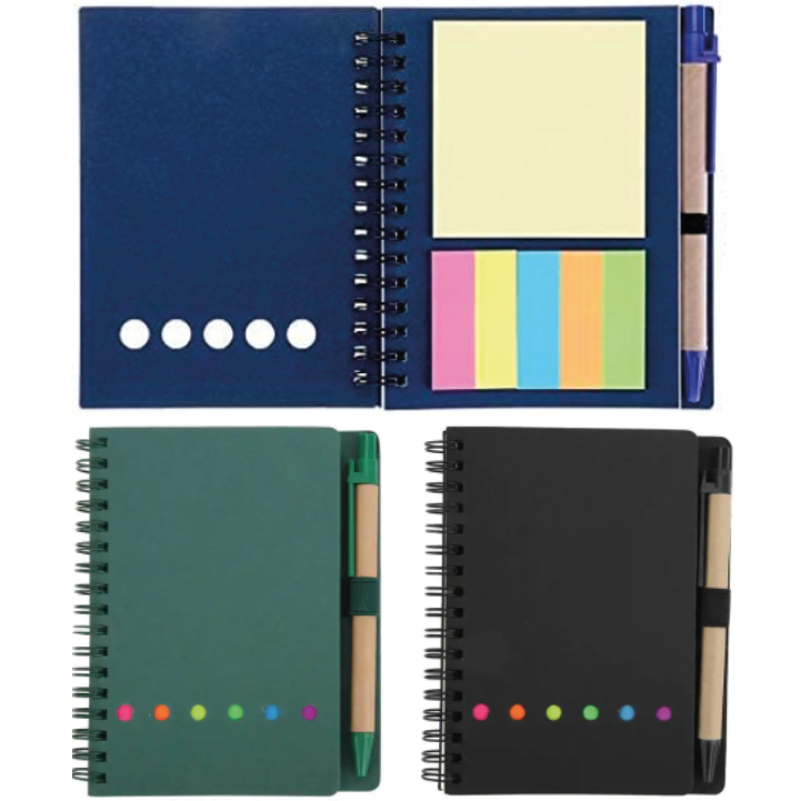 Ecológica, con espiral, notas adhesivas y lapicero, de 14.5 x 11.5 cm, 60 hojas, en azul, verde y negro